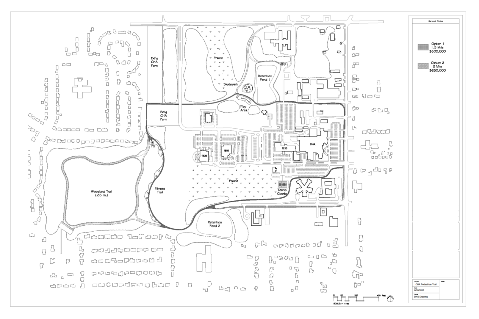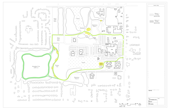 This Schematic plan was used to get a better understanding of the proper scale of design elements and also to create a ROM Rough Order of Magnitude estimate for the hospital. This ROM estimate gives the hospital a ballpark idea of the cost of this project and allows them to budget and phase plan the project. The main trail loop is a 1.5 mile 10' wide asphalt trail that connects to a woodland trail, a fitness trail, and the activity spcaes that are spaced out along the trail.