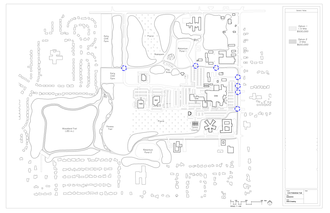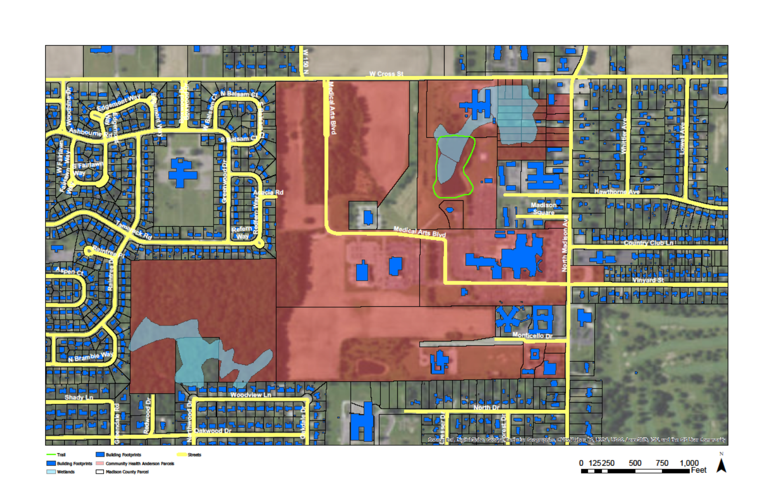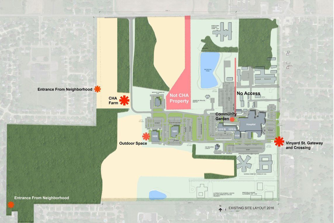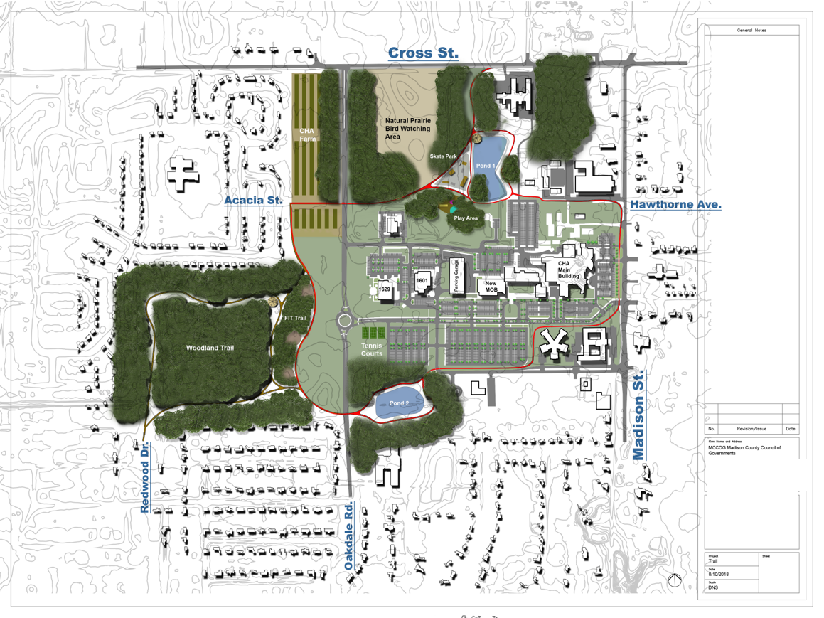 Community Hospital Anderson is in the process of integrating its campus with the adjacent neighborhoods and connecting to other key sites in the city of Anderson. Community Hospital Anderson is strengthening its health and wellness concept by increasing activity space around the hospital and connecting it to the adjacent neighborhoods. Currently, the master plan calls for a 1.5-mile trail that connects a fitness trail, woodland trail, skatepark, play area, CHA farm, a nature preserve area, tennis courts, and pavilions. This large activity and wellness hub is meant to be the center of the health district, a concept that spawned from the (MCCOG) transportation departments Healthy Places for Healthy People Initiative.