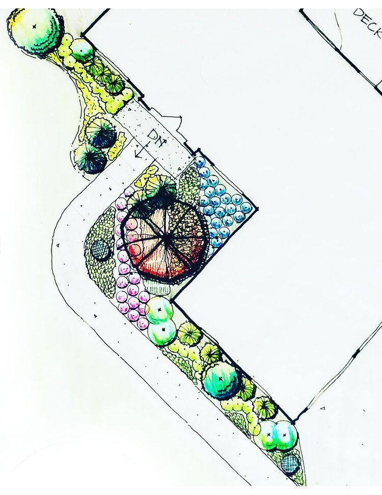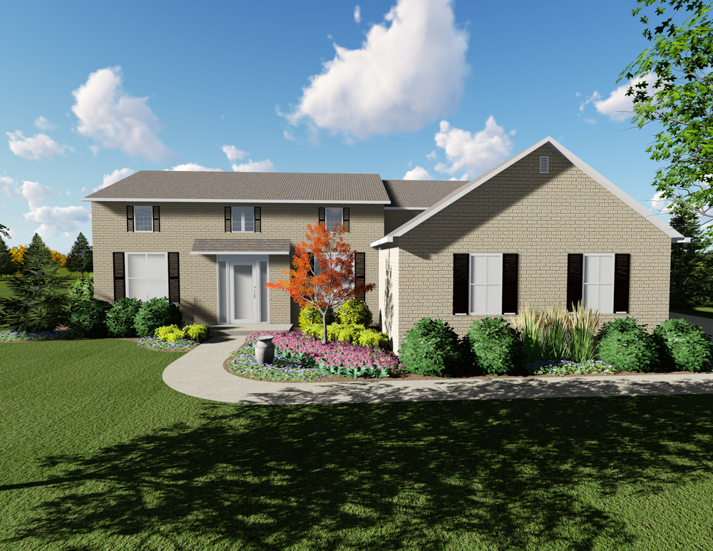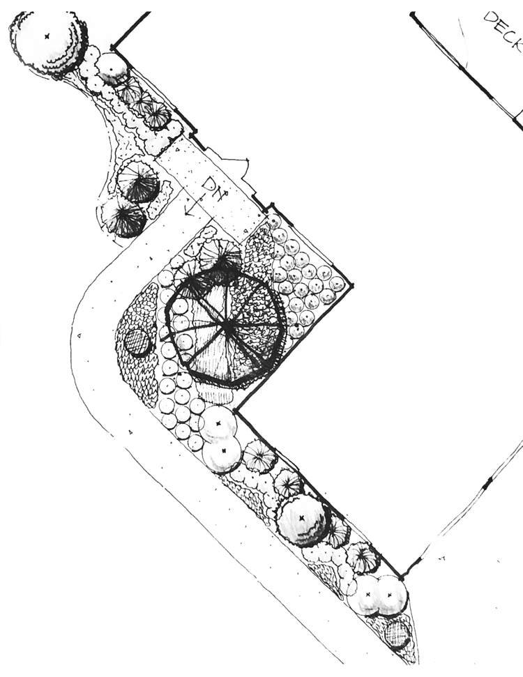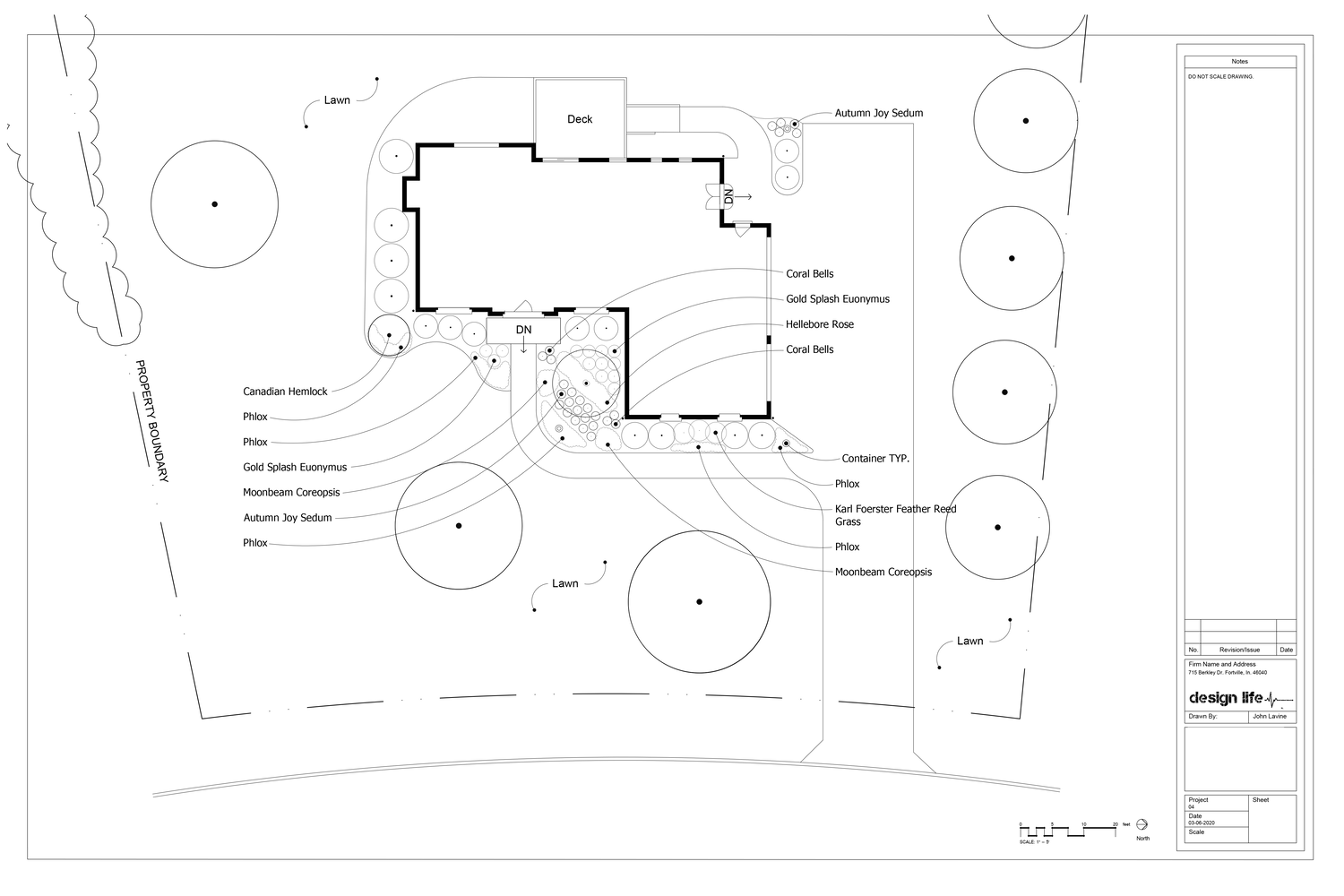 This design was all about the appearance of the street and enhancing the main entrance to the home. The architecture design is very formal, so the approach was to complement the style of the house through the landscape. The ordering system is a grid with layered planting arrangements and large perennial massings. The grid near the entryway was tilted on a 45-degree angle to make things a bit more exciting and attract visitors' attention while heading to the main entrance. This angle also provides a better view as the homeowner is entering or leaving the home. Another goal of this project was to provide all-season interest by incorporating evergreens and plants that bloom at different times.