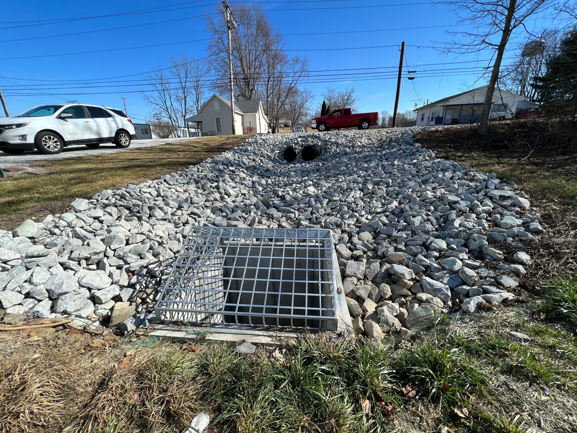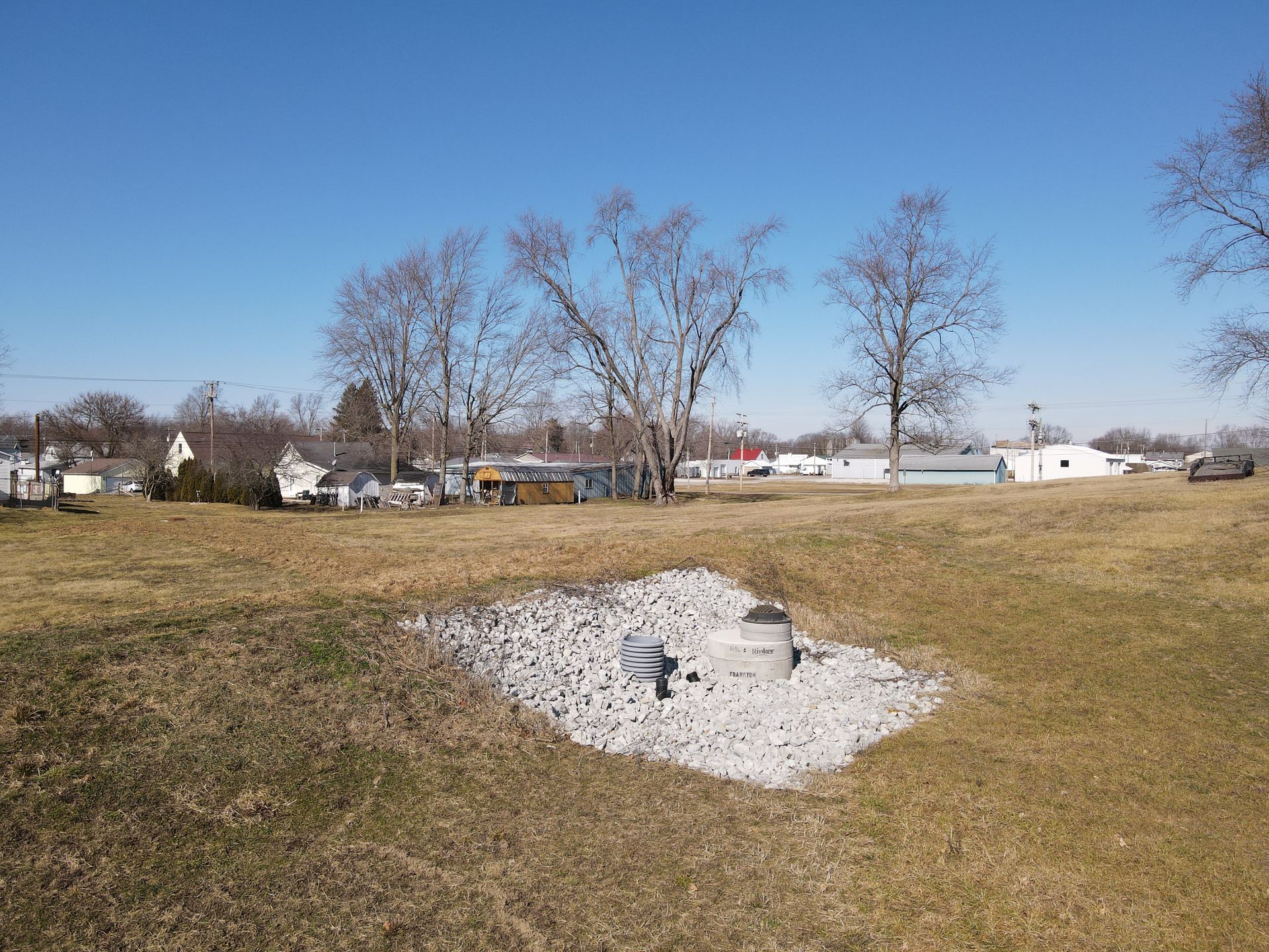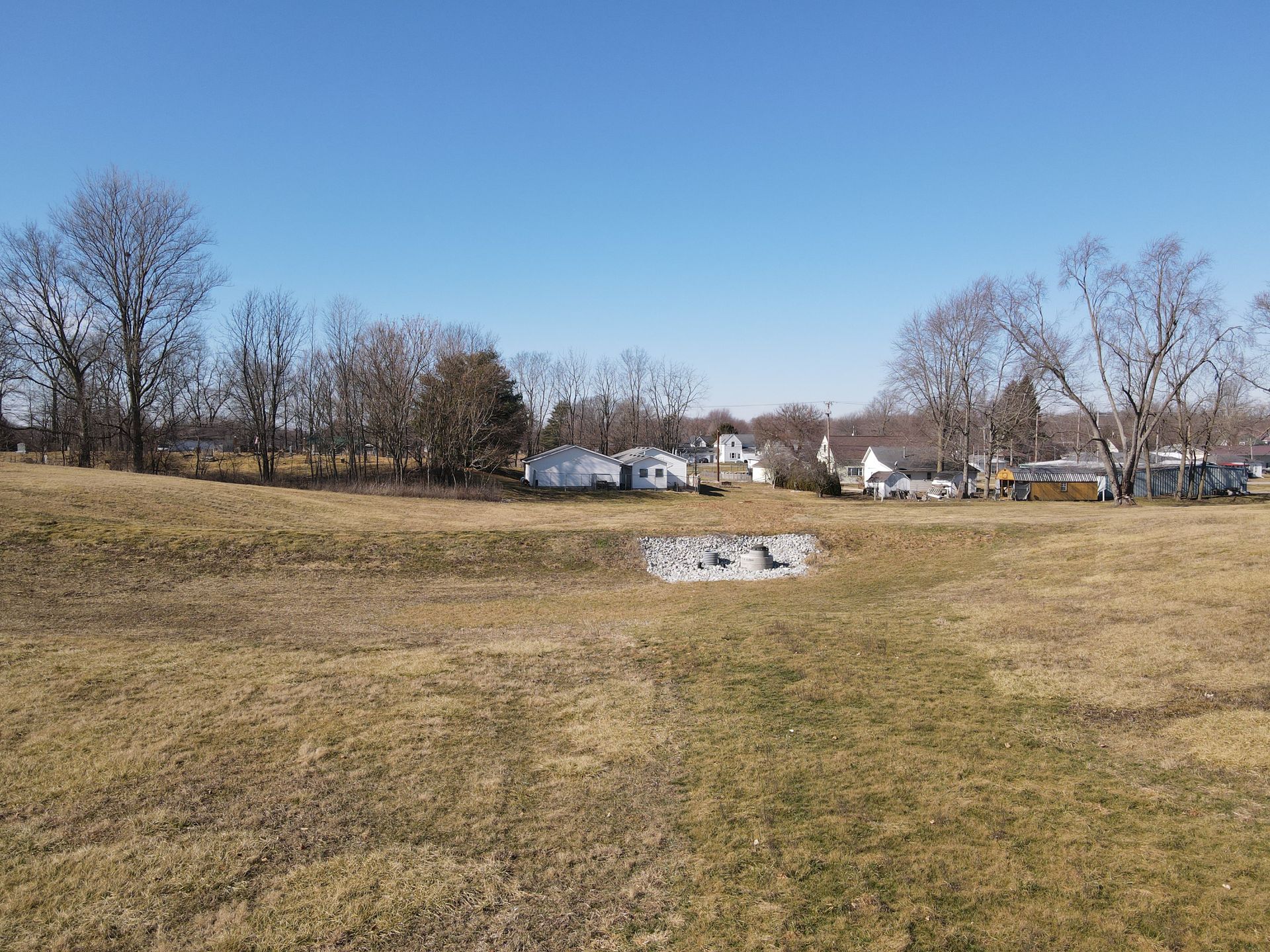 The Frankton Drainage Solution design responds to an area in Frankton containing dramatic topography with a valley in the center where substantial runoff collects during rainstorms. This runoff floods adjacent property owners’ homes as a result. Plans were drawn for Frankton based on current best practices and stormwater runoff calculations. The resulting design comprises a large water detention basin with a four-foot tall clay berm as well as an emergency spillway, large-diameter underground drain culverts, and above-ground swales. The system mitigates runoff by temporarily storing it then releasing it slowly, so it is diverted from the adjacent properties. Most of the time, the basin is an empty, large, grassy field until significant rainstorms when it functions as storage volume for the stormwater runoff.